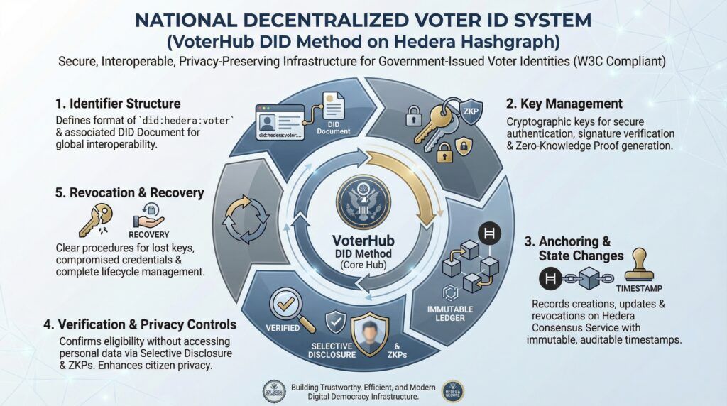 A national decentralized voter ID system requires a clearly defined DID method that establishes how identities are created, anchored, verified, updated, and revoked on Hedera Hashgraph. The method must follow W3C DID standards to ensure interoperability with existing identity ecosystems while remaining tailored to the unique requirements of voter identification. At a high level, the VoterHub DID method consists of five core components: (1) Identifier Structure, defining the format of a did:hedera:voter identifier and its associated DID Document; (2) Key Management, specifying the cryptographic keys used for authentication, signature verification, and zero‑knowledge proof generation; (3) Anchoring and State Changes, outlining how DID creation, updates, and revocations are recorded on Hedera’s consensus service with immutable timestamps; (4) Verification and Privacy Controls, establishing how verifiers confirm eligibility without accessing personal data, using selective disclosure and ZKPs; and (5) Revocation and Recovery, defining procedures for lost keys, compromised credentials, and lifecycle management.
