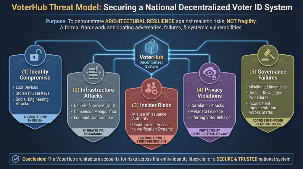 Any national‑scale decentralized voter ID system must be designed with a formal threat model that anticipates adversaries, operational failures, and systemic vulnerabilities. The purpose of the threat model is not to imply fragility but to demonstrate that the architecture accounts for realistic risks across the entire identity lifecycle. At a high level, the VoterHub threat model addresses five categories: (1) Identity Compromise, including lost devices, stolen private keys, and social‑engineering attacks; (2) Infrastructure Attacks, such as denial‑of‑service attempts, consensus manipulation, or endpoint compromise; (3) Insider Risks, including misuse of issuance authority credentials or unauthorized access to verification systems; (4) Privacy Violations, such as correlation attacks, metadata leakage, or attempts to infer voter behavior; and (5) Governance Failures, including misaligned incentives, unclear revocation procedures, or inconsistent implementation across states.