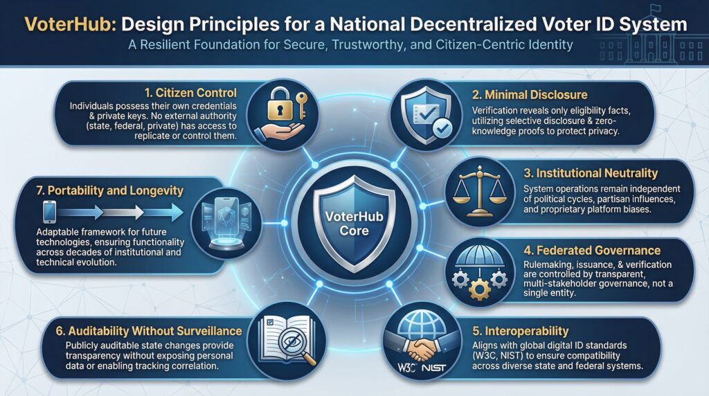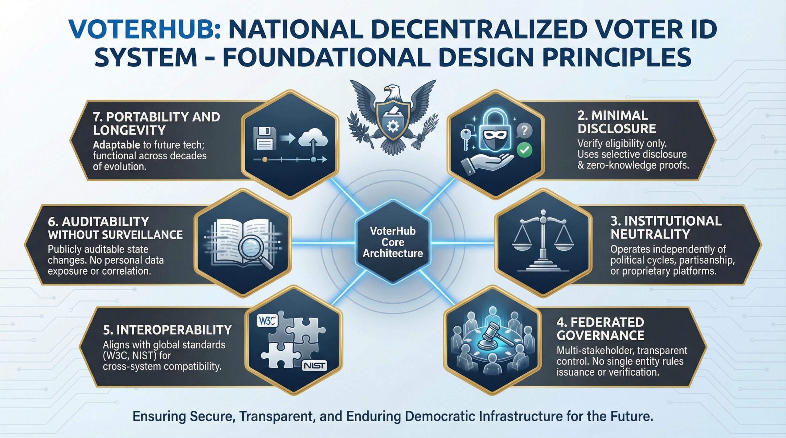 A national decentralized voter ID system must be grounded in clear, non‑negotiable principles that guide its architecture, governance, and implementation. The following principles define the foundation of VoterHub: